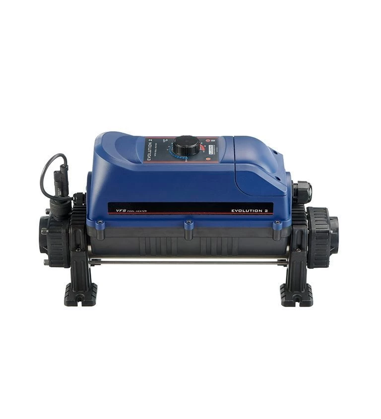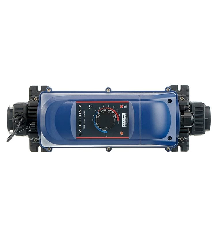 Evolution 2 elektrische warmtewisselaar met Titanium wisselaar. Deze elektrische zwembadverwarming is efficiënt, veilig en betrouwbaar. Het verwarmingstoestel is heel geschikt voor het opwarmen van zwembadwater en spa baden tot een temperatuur van 28°C (zwembaden) of tot 38°C (spa baden). Doordat de wisselaar is vervaardigd in titanium kan u deze verwarming gebruiken in combinatie met een zoutelectrolyse.