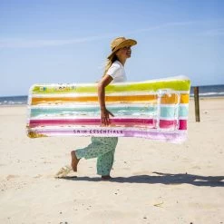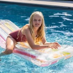 Luxe luchtbed met glitters en regenboogkleuren met grote afmeting L 180cm x B 80cm x D 16cm. De extra dikke opblaasbare drijvend ligbed zorgt voor een zeer comfortabele ligging.